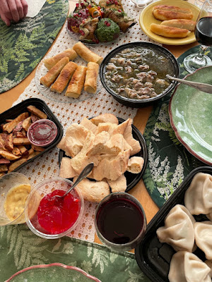 Tim's Dad got his recent physical therapy finished and came home. However, he needs additional help and we have a new family member - Ana. Ana is this wonderful, sweet, hard working person that we absolutely love. She has been a huge plus to our household helping Tim's Mom with John's care and she is a foodie just like us. We went down to visit and had this marvelous weekend. Ana is introducing us to Georgian food and we had this lovely dinner together with food and wine from a local Georgian restaurant. Plus, Ana made us some of her own favorites which are absolutely delicious. So glad to have her in our lives.